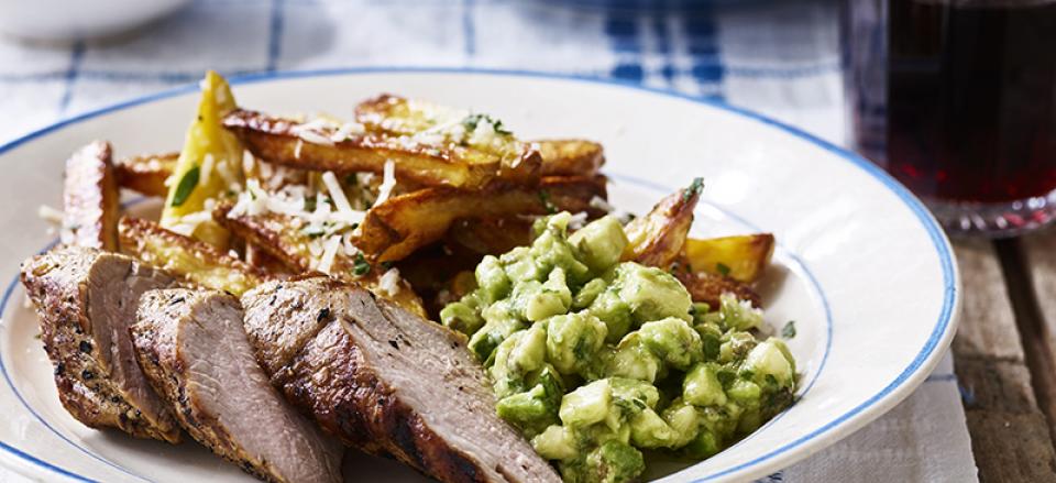 Grillet mørbrad med avocado-salsa verde og ovnfritter med parmesandrys