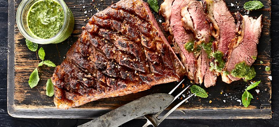 Grillet oksecuvette med krydderiblanding og mynte-persillepesto