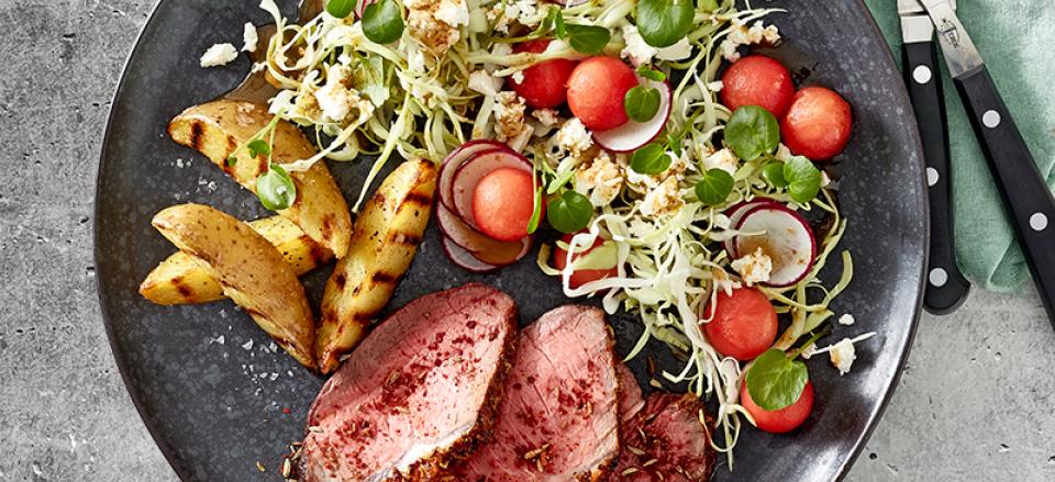Grillet oksetyndsteg med grillede kartoffelfritter og spidskålssalat med vandmelon og feta