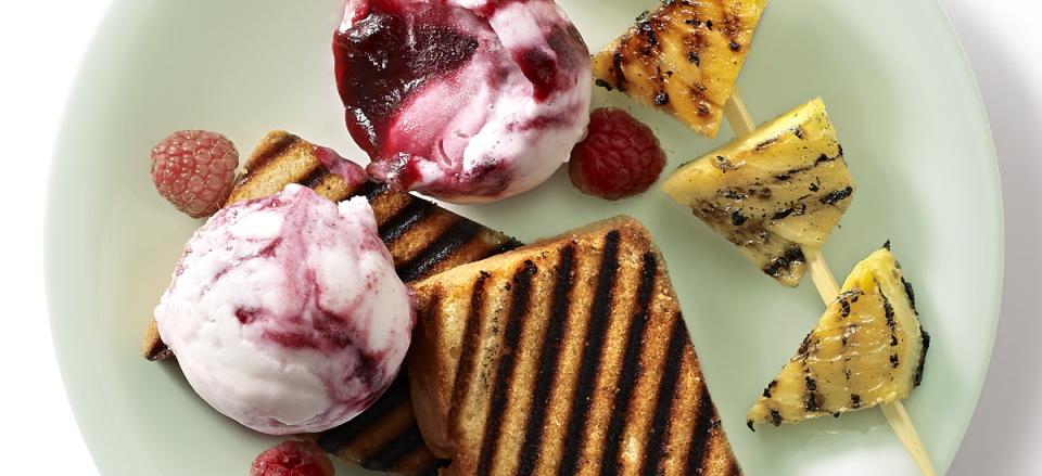 Servér den grillede sandkage med ananasspyd, friske hindbær og is.