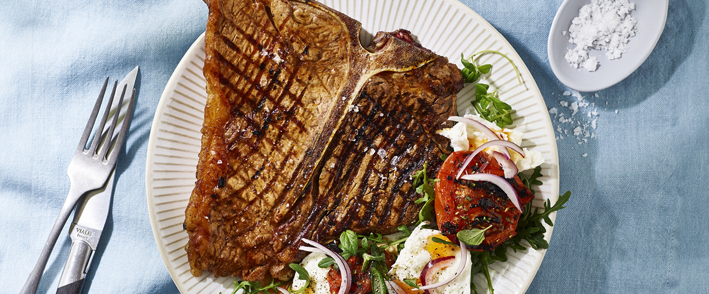 Grillet T-bone og grillet tomatsalat med mozzarella