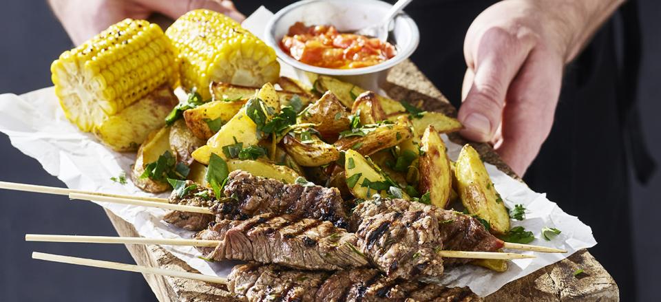 Grillspyd med tyksteg, konfiterede tomater, grillet majs og hvidløgsfritter