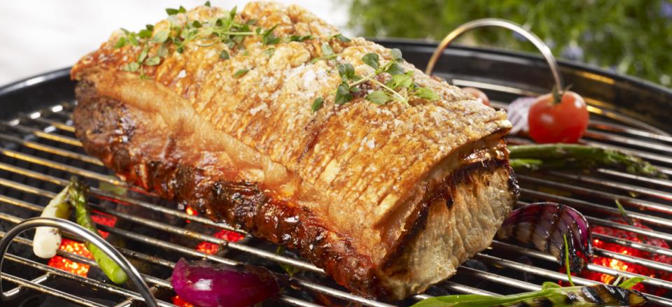 Steg ca. 90 minutter ved indirekte varme til sværen er tilpas sprød, og kernetemperaturen er mindst 68°C.