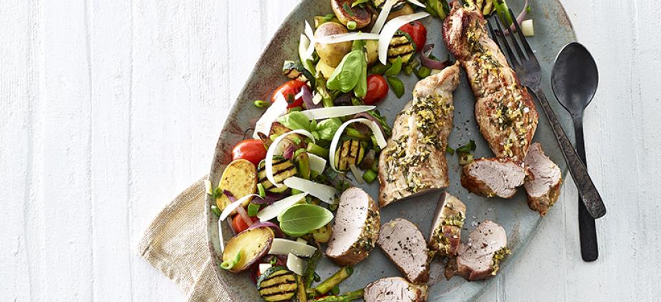 Kom grøntsagsfyldet på et fad sammen med skiver af svinemørbrad.