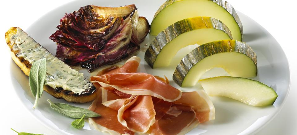 Grøn Honningmelon med serranoskinke, grillet radicchio og salvie-croutoner