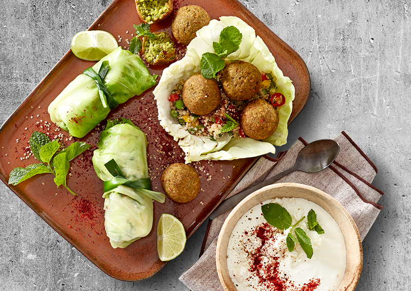 Kom et par skefulde quinoasalat og to-tre lune falafler i hvert kålblad.