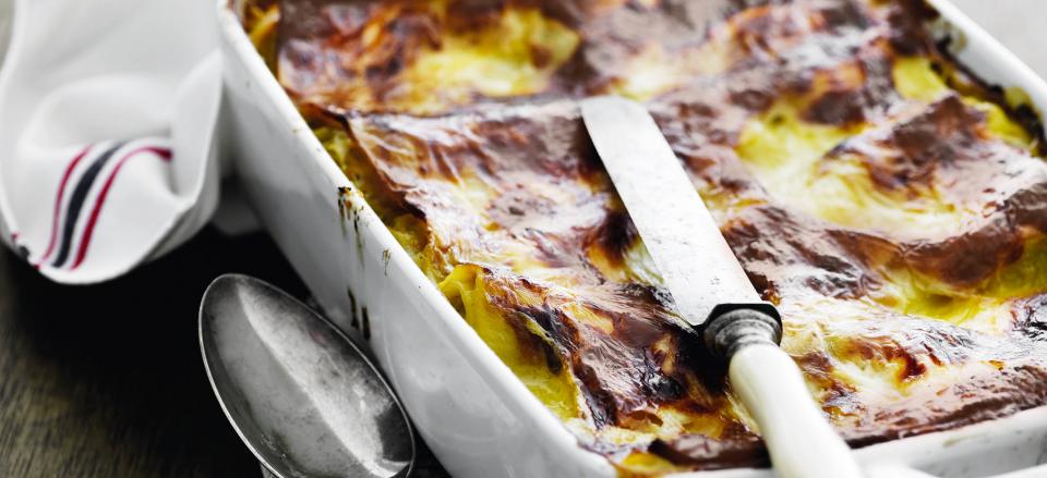 Læg skiftevis lasagneplader, grønsager og bechamel-sauce i et smurt fad, indtil