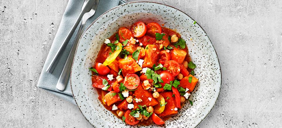 Kom hakket tomat og grøntsags bouillon i og lad retten små simre i 30 min.