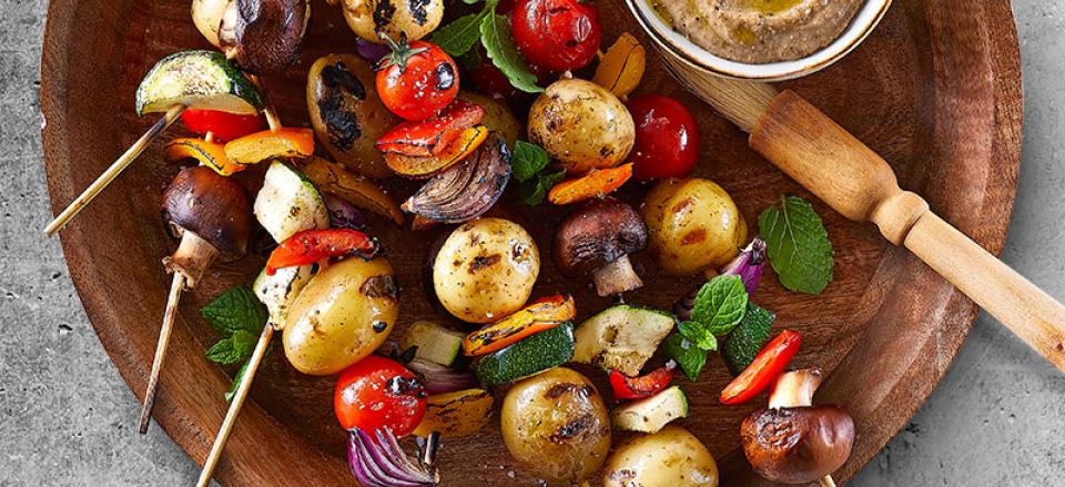 Servér grøntsagsspyd med tahin-marinade og frisk mynte.