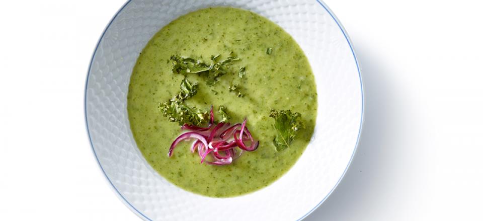 Grøntsagssuppe med syltede rødløg og crispy kålchips