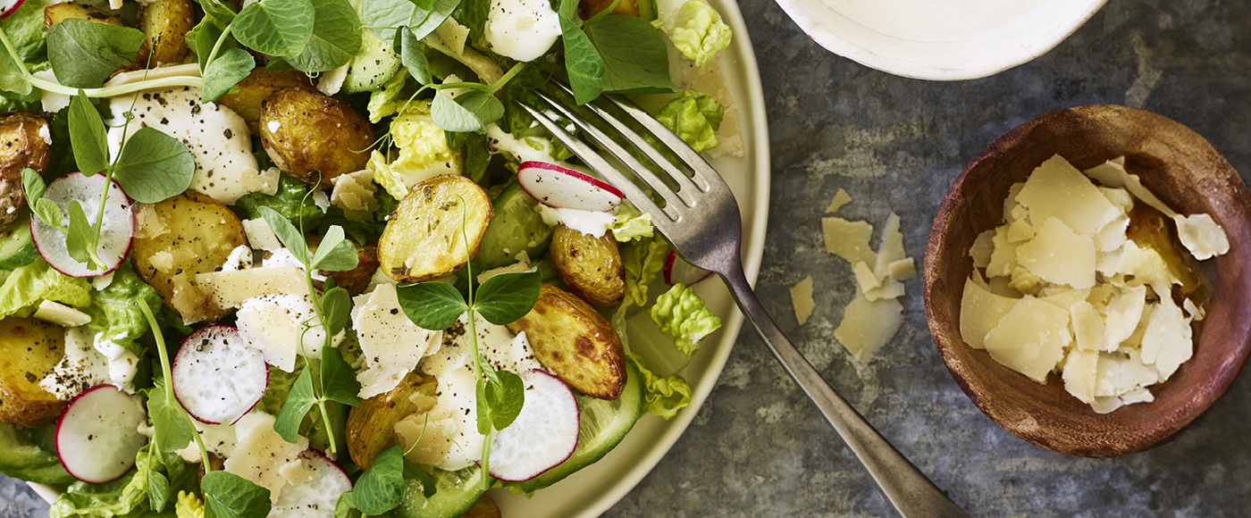 Grøn salat med rosmarinbagte kartofler, ærteskud og parmesandressing