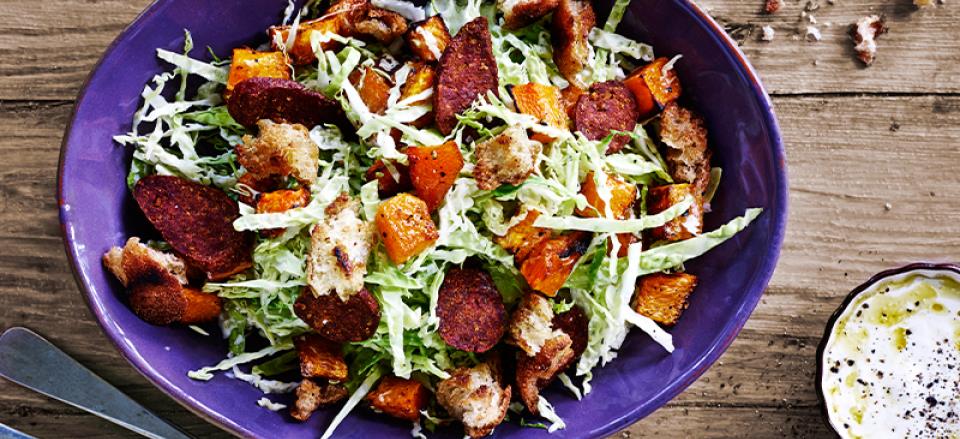 Grov salat med græskar, kål og chorizo-croutoner