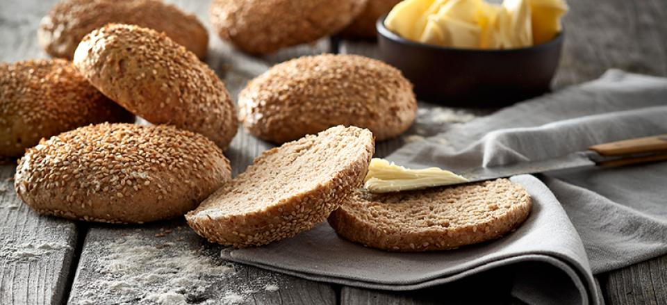 Pensl bollerne med kærnemælk og drys med sesamfrø.