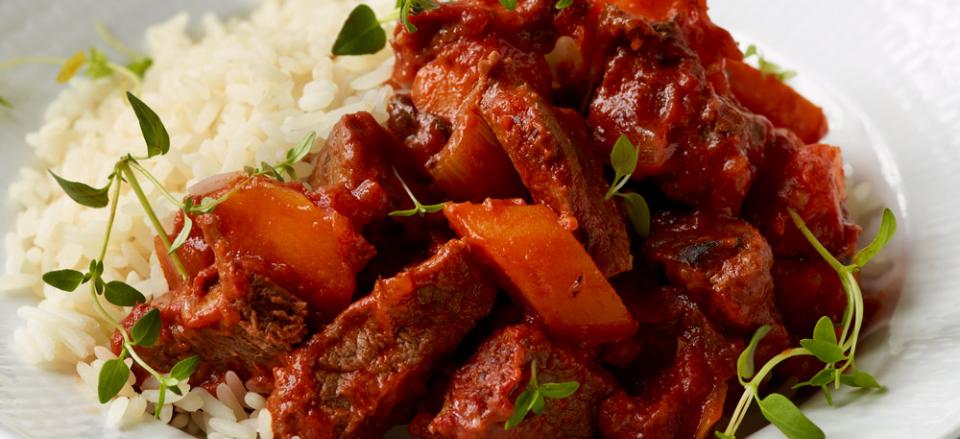 Drys hvedemel over og tilsæt flåede hakkede tomater, tomatpuré, timian og rødvin og bouillon.