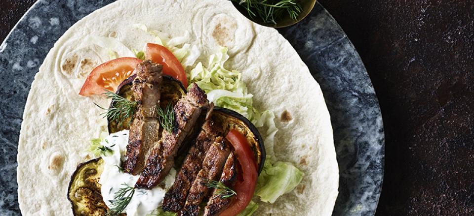 Skær kødet i skiver og server i wraps med salat, tomat, bagt aubergine og tzatziki.