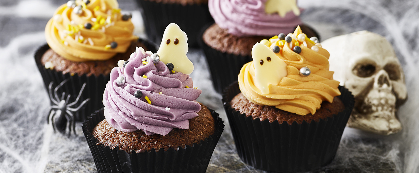 Lad det hærde færdigt i køleskabet, og pynt dine cupcakes med de små spøgelser og lidt krymmel.
