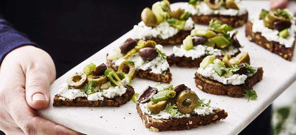 Hapser med gedeost, oliven, forårsløg og krydderurter