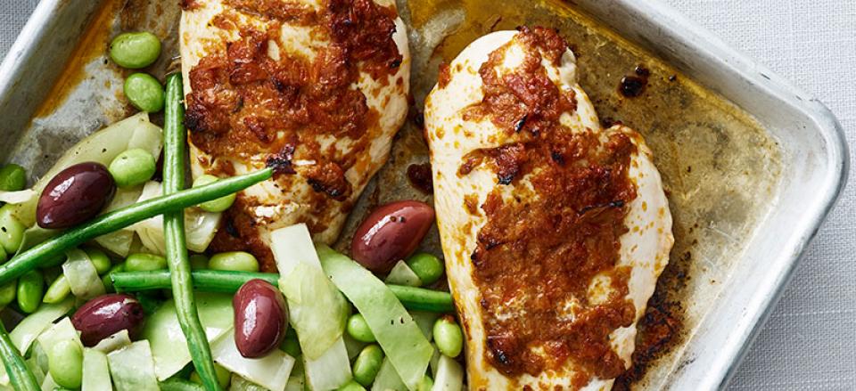 Skær 5-6 dybe ridser i hvert kyllingebryst og smør pesto over.