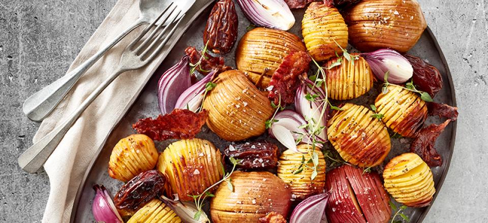 Hasselbackkartofler og æbler med karamelliserede rødløg, dadler og bacon