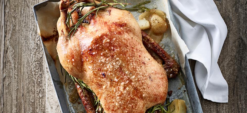 Fyld anden med æblefyldet og luk den med stegenåle og kødsnor.