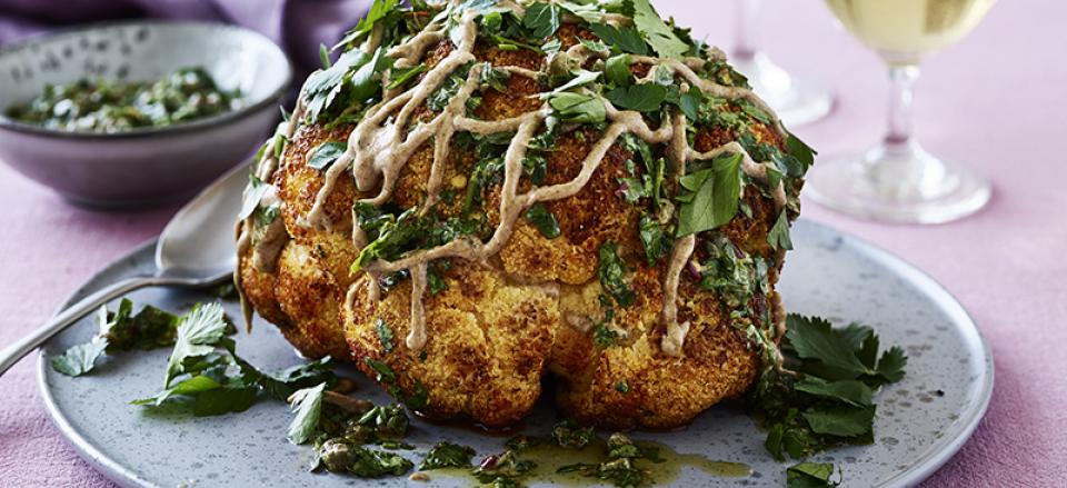 Server det bagte blomkål med tahindressing og salsa verde – drys evt. med ekstra persille og koriander.