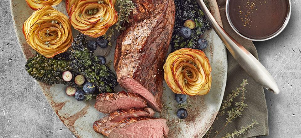 Skær den helstegte oksemørbrad i skiver, og anret den på et fad med pommes anna, palmekålchips og friske blåbær.