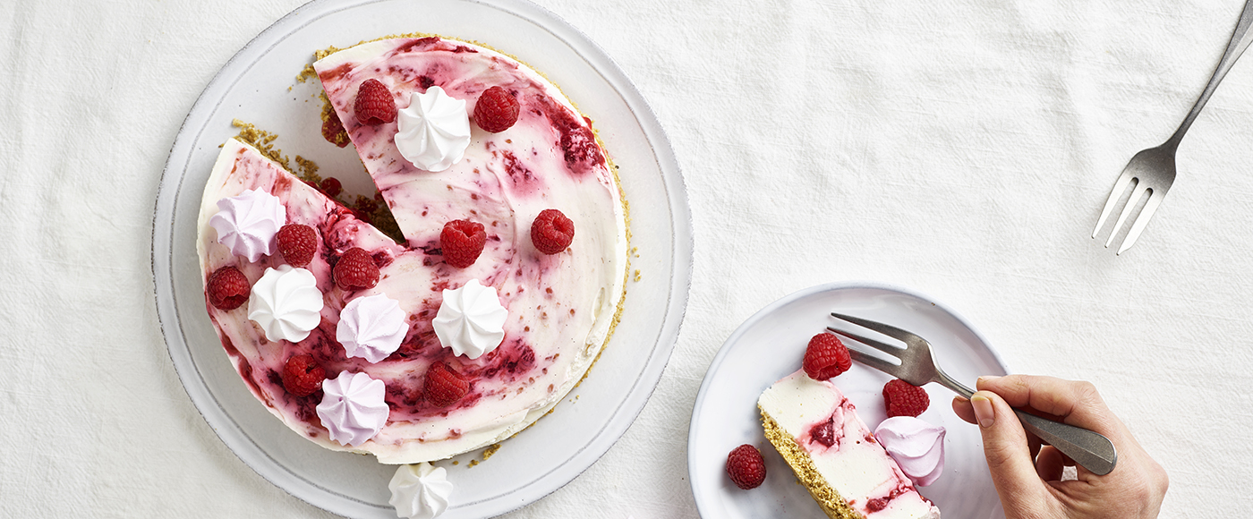 Læg skefulde af hindbærsaucen oven på ostecremen, og brug en kniv til at snirkle lidt rundt i det, så der dannes et flot mønster.