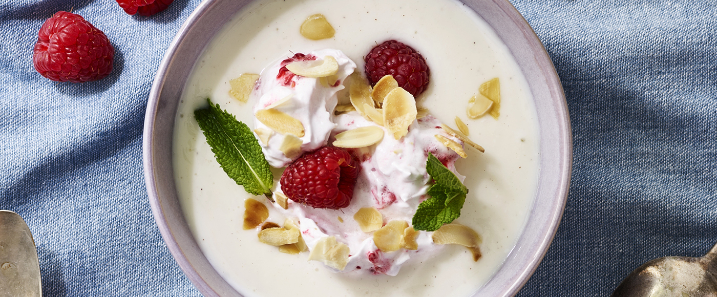 Kom en god skefuld guf på koldskålen og drys med mandelflager og hindbær.