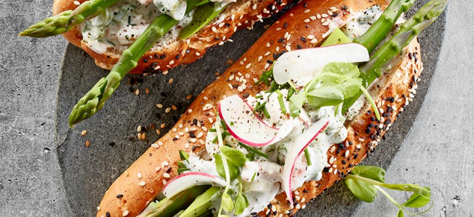 Skær et snit i hver hotdog, placer ca. 3 stykker grønne asparges, top med rejesalat, pynt med radiser i skiver, purløg og ærteskud.