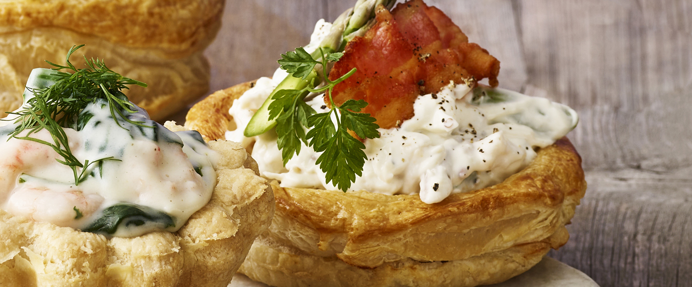 Fyld hønsesalaten i butterdejsrederne og pynt med bacon, aspargestoppe og lidt kørvel.