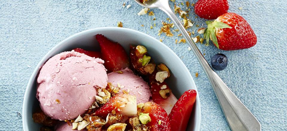 Server isen med friske blåbær eller friske jordbær og hakket nøddekrokant.