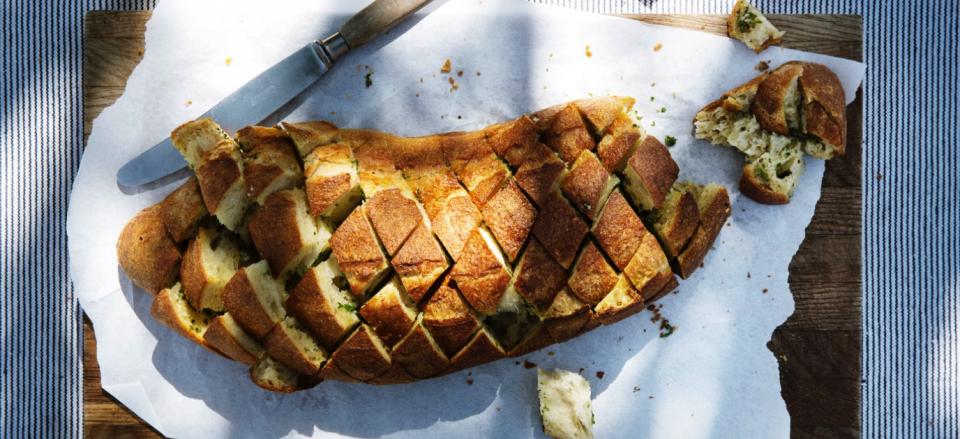 Skær skiver på skrå 2/3 gennem brødet, så det stadig hænger sammen.