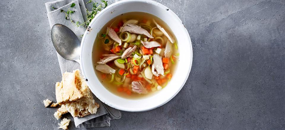 Hønsekødssuppe med rodfrugter, porrer og melboller