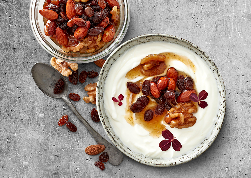 Servér evt. de syltede nødder og rosiner sammen med skyr.