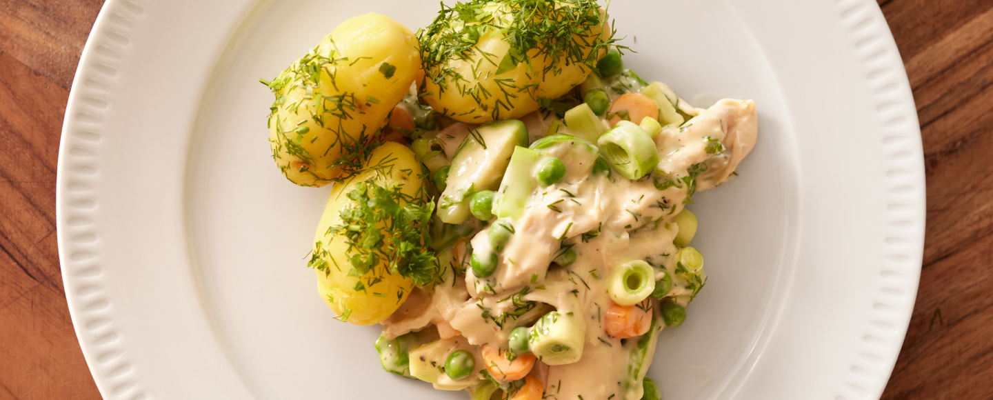 Nu kan hønsekødet og grøntsagerne kommes i, og disse skal varmes godt igennem, inden retten kan serveres med masser af hakket dild, persille og kogte nye kartofler.