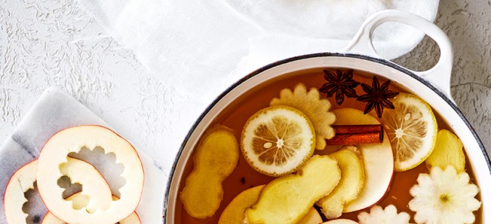 Kom æblecider i en gryde med honning, ingefær i tynde skiver, kanel og stjerneanis.