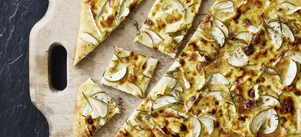 Hvid pizza med brie, pære, honning og rosmarin