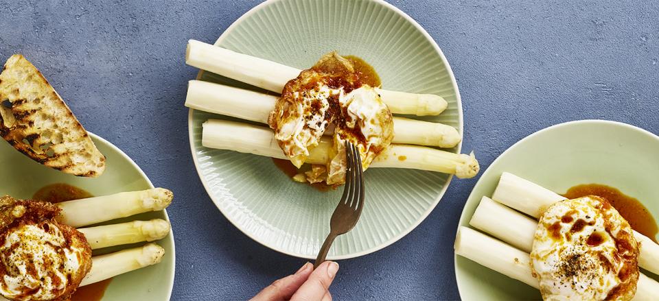 Anret asparges, og kom et æg oven på hver portion.