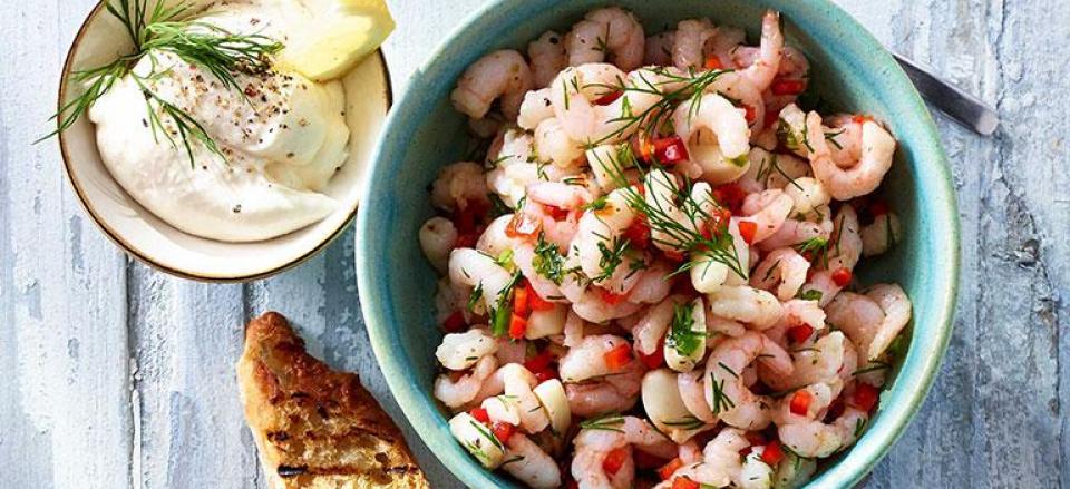 Bland rejer med hakket dild, rød chili i små tern, rød peber i små tern, marinerede hvidløg, salt, frisk kværnet peber og god olivenolie.