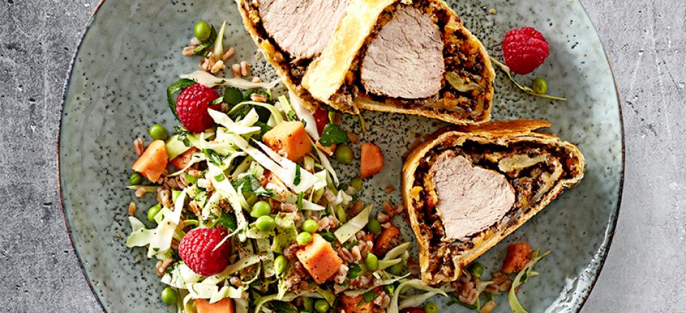 Indbagt mørbrad af gris med abrikos, oliven og timianfyld