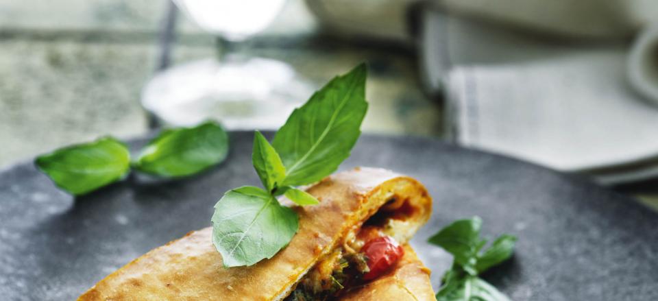 Pas på, du ikke kommer for tæt på kanten, for du skal kunne lukke dejen, når du har drysset mozzarella i små stykker og basilikum over.