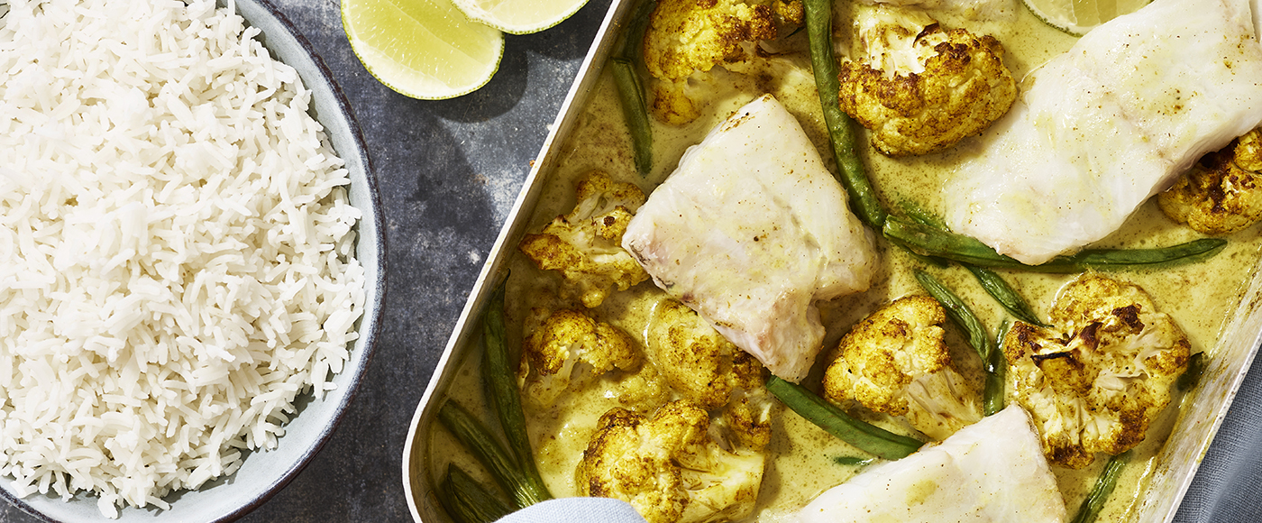 Indisk fiskefad med blomkål, grønne bønner og ris