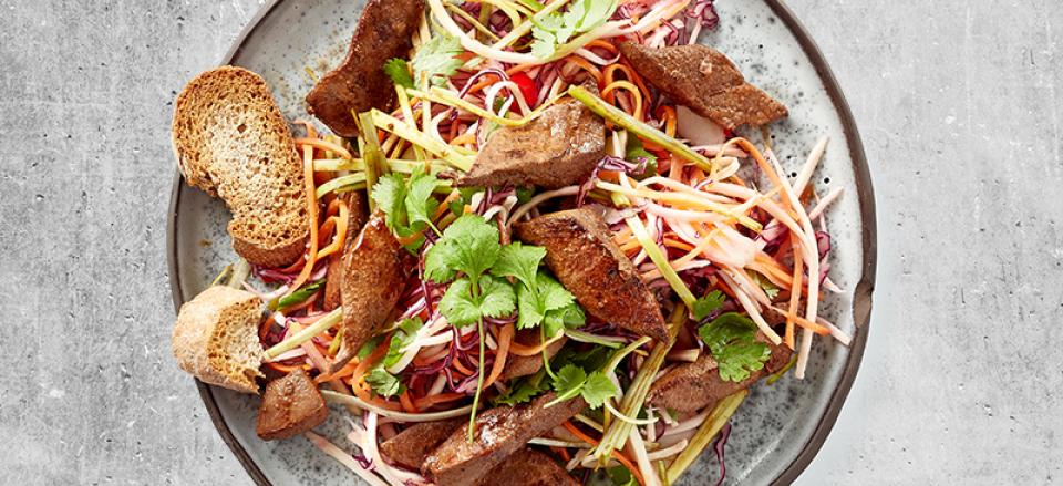 Ingefærstegt lever med asiatisk rodfrugtsalat