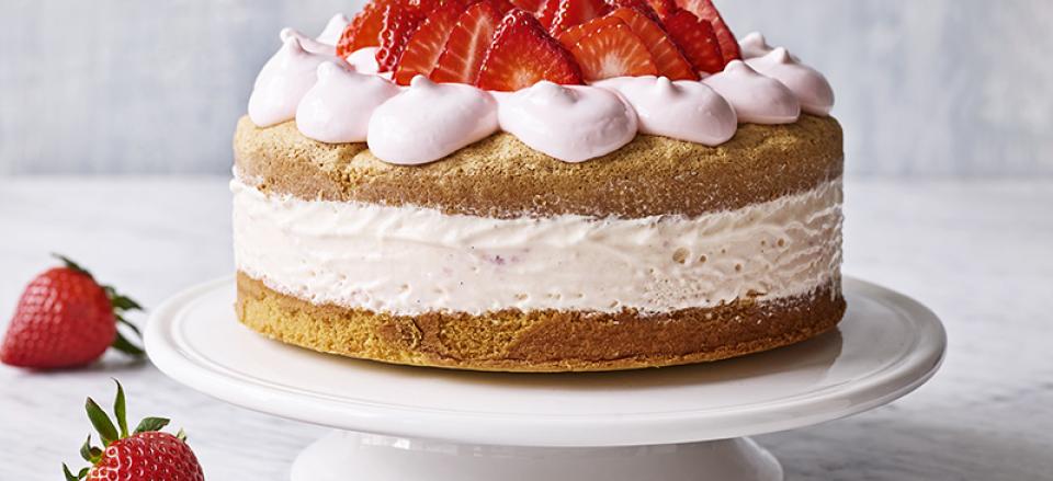 Kom guf i en sprøjtepose, og dekorer kagen med guf og jordbær.