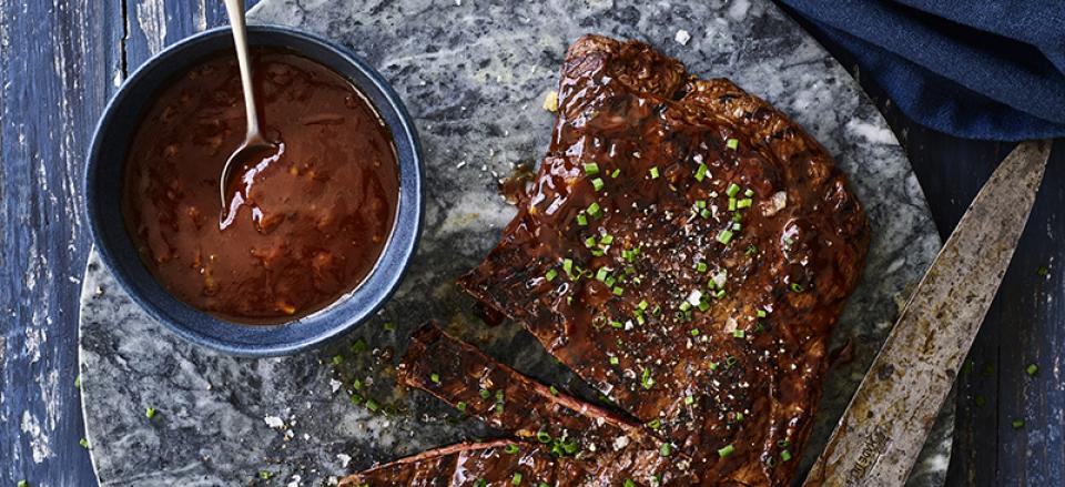 Jack D bbq flanksteak med hjemmelavet hvidløgs-osteflute