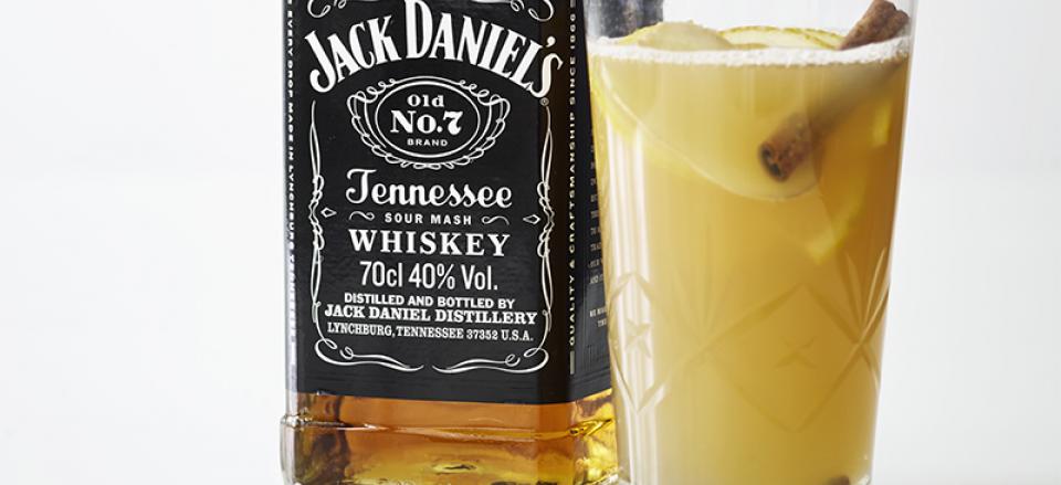 Kom whiskey, citron, appelsin og kanelstang i et glas, og hæld den varme æblemost i.