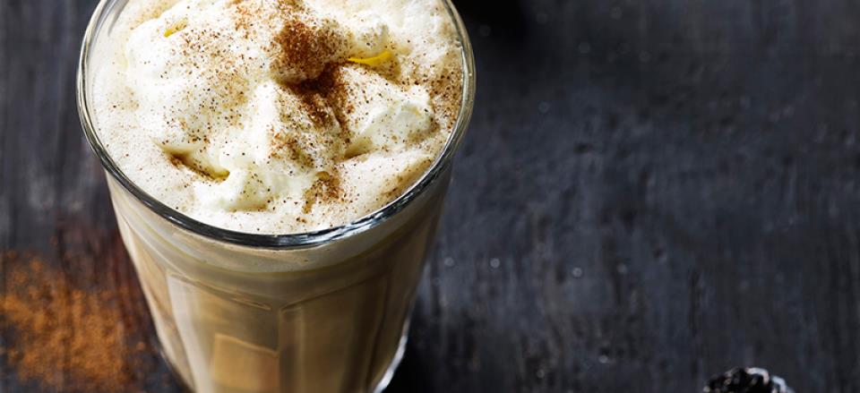Top med varm, opskummet mælk, flødeskum og et drys kanel.
