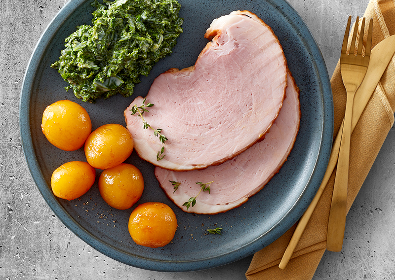 Juleskinke med grønlangkål og brunede kartofler