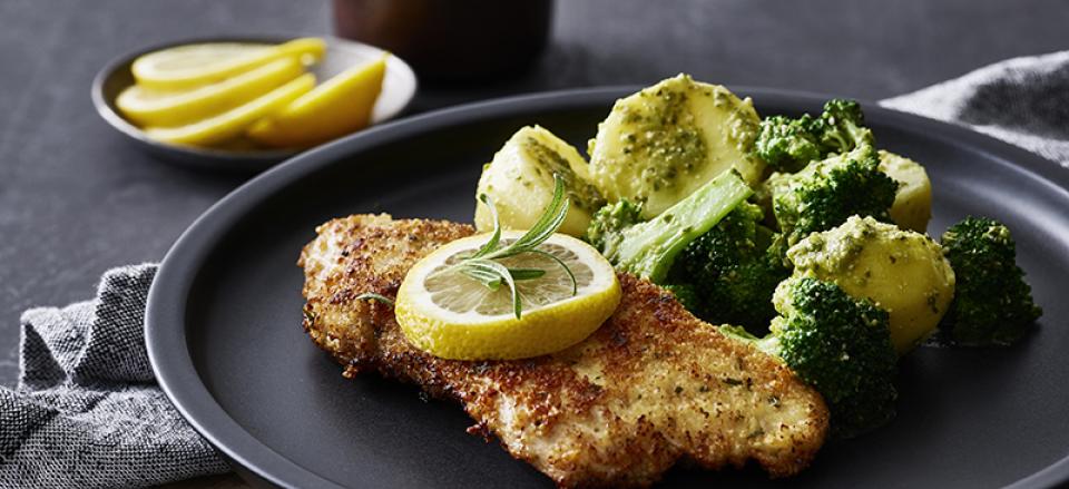 Kalkunschnitzler med parmesan, kartofler og broccoli med pesto