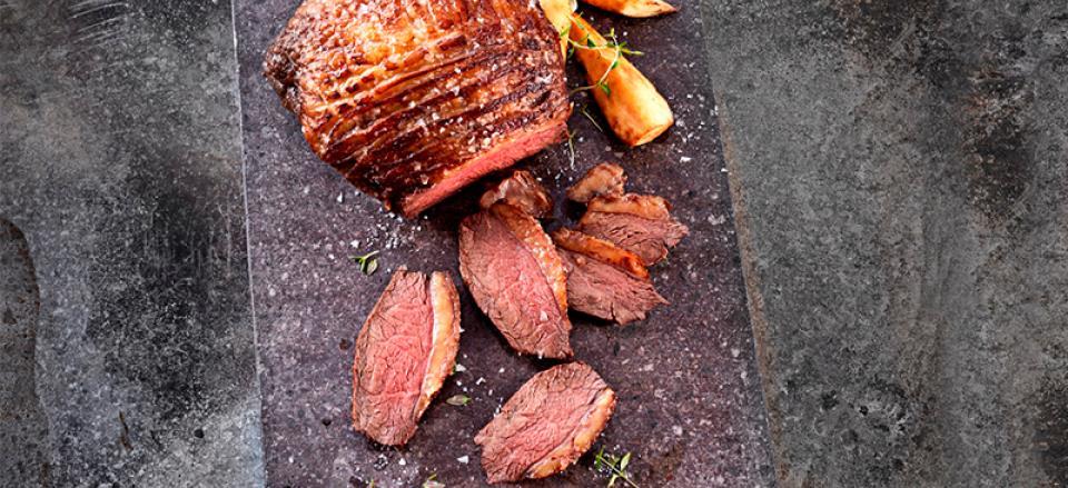 Servér skiver af culotten sammen med de bagte rodfrugter.